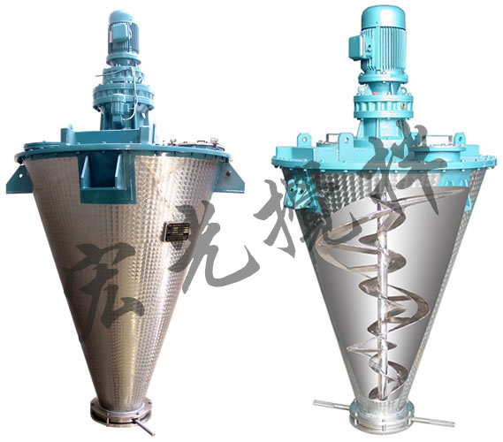單錐雙螺旋錐形混合機(jī),它由傳動部分、筒蓋、螺旋、筒體、出料閥等組成。
