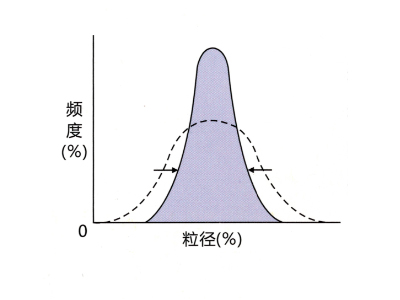 粒度分布![]() 相比傳統(tǒng)磨機,即使在相同的平均粒徑,它可以得到集中的粒度分布。 |